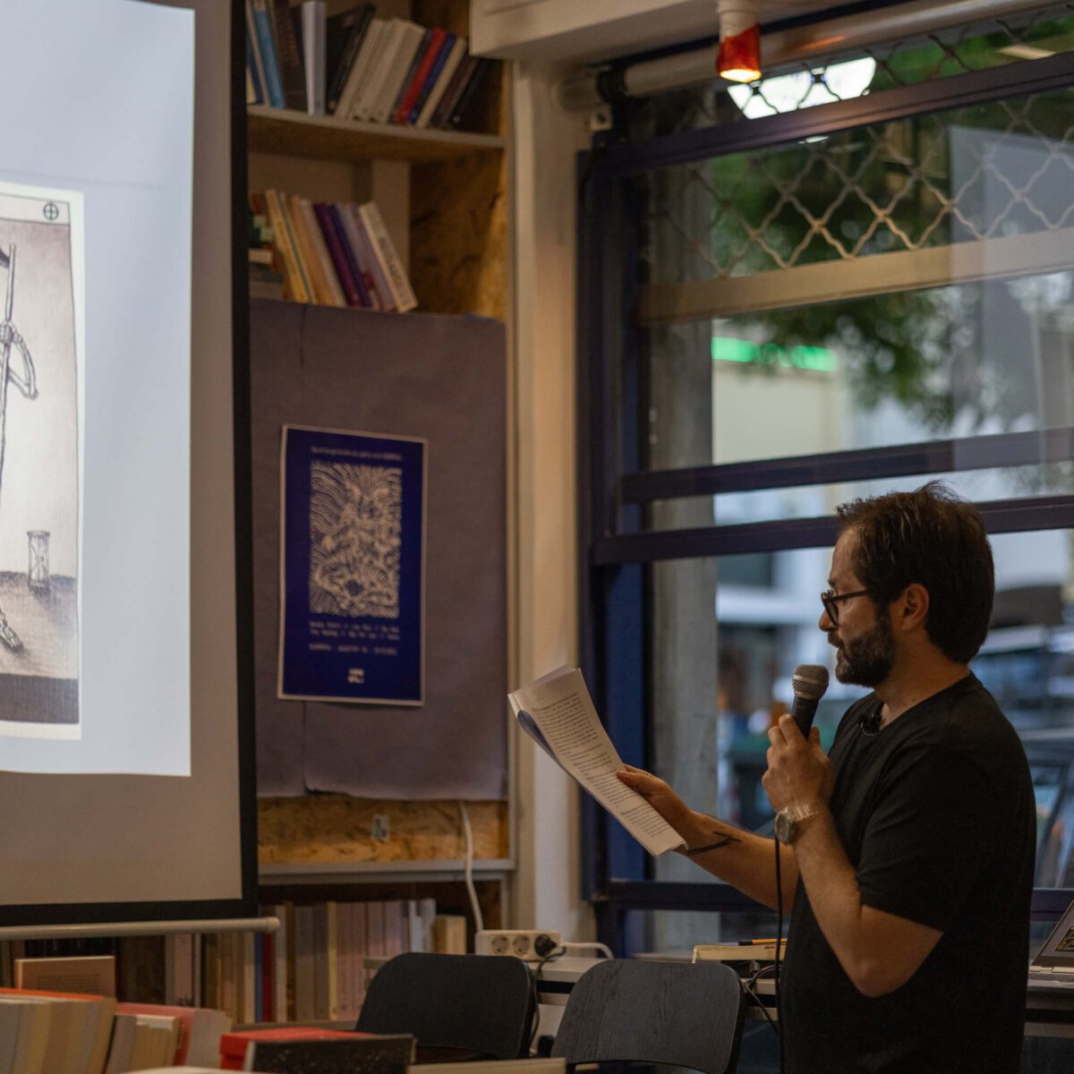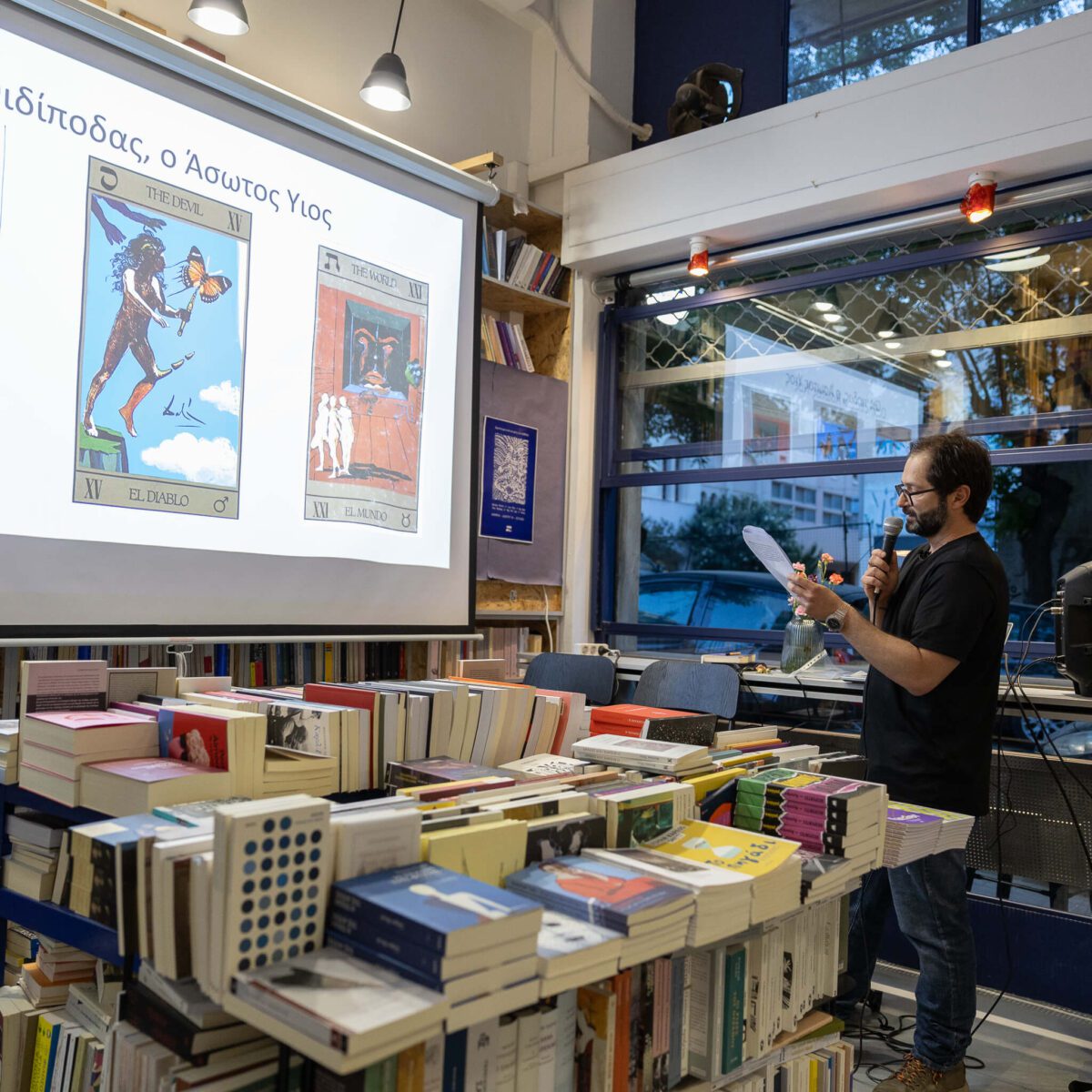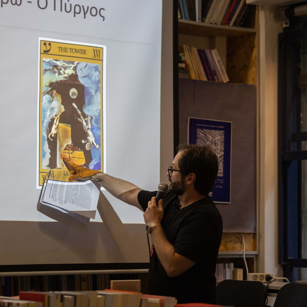 Κεντρικό στοιχείο της παρουσίασης αποτέλεσε η προβολή ενός 20λεπτου βίντεο, πριν και μετά την ομιλία, λειτουργώντας ως ένα είδος προετοιμασίας και αποτύπωσης της εμπειρίας. Μέσα από αυτό, αναδείχθηκε ο τρόπος με τον οποίο τα αρχέτυπα του Ταρώ μπορούν να συνδεθούν με σκηνές του θεάτρου και του κινηματογράφου, αλλά και με την καταγραφή σημαντικών ιστορικών γεγονότων.