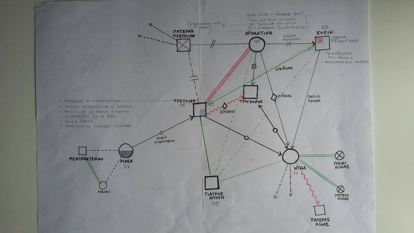 Ως επιπλέον εργαλείο χρησιμοποιήθηκε το γενεόγραμμα, προκειμένου να χαρτογραφηθεί η επικρατέστερη συναισθηματική δυναμική ανάμεσα στους χαρακτήρες. Το διάγραμμα αυτό λειτούργησε ως αφετηρία για τη σωματική αναπαράσταση των σχέσεων, επιτρέποντας στην ομάδα να απομακρυνθεί από τον ψυχολογικό ρεαλισμό και να στραφεί σε μια συμβολική, αρχετυπική γλώσσα.